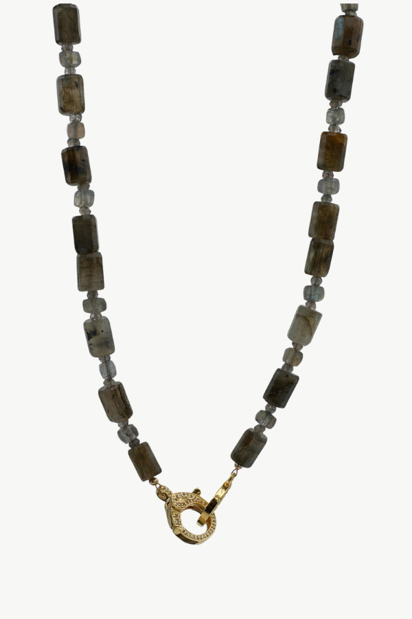 The Layla Necklace - 16.5" Layla is that girl. The mysterious one. The one who walks in and suddenly everyone's wondering why the lighting looks better. Hand beaded with a triple threat of AAA quality labradorite - bold 7mm x 10mm tubular beads, edgy 5mm cube beads, and tiny 3mm rondelles that catch the light - she shifts and flashes with every move. At 16.5", Layla sits perfectly at the collarbone, close enough to sparkle in conversation. She's finished with a pave diamond lobster clasp and our signature Harvest Jewels H ring, heavily gold-plated and coated for longer wear and durability, because a necklace this dramatic deserves staying power. Moody. Magical. Slightly extra. Layla doesn't chase the spotlight, she reflects it.