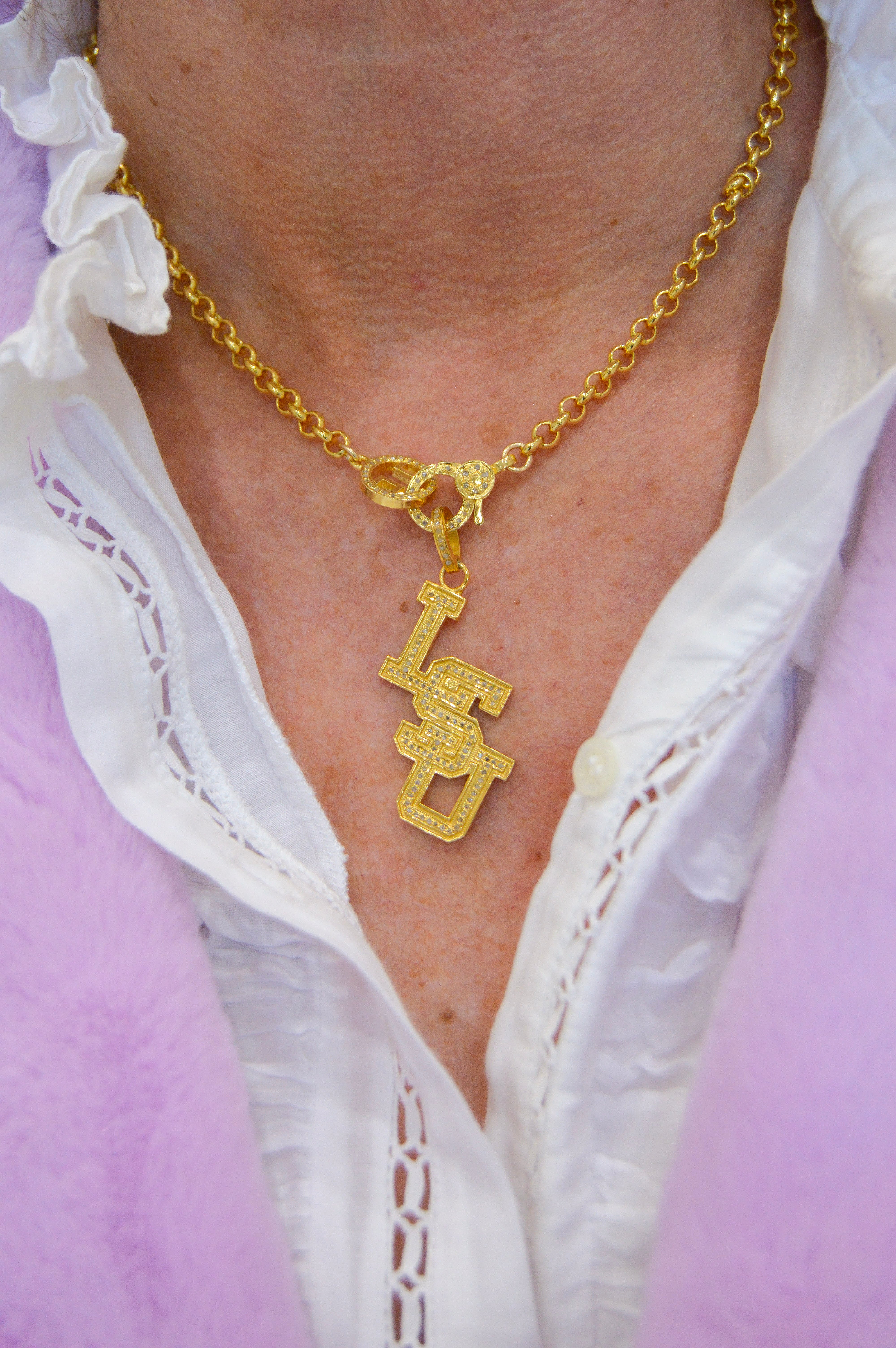 Officially Licensed by FOSTER, this stunning LSU pendant shines in yellow gold plating and is adorned with pave-set diamonds, including a sparkling diamond-accented bail. Thoughtfully crafted with a thick layer of gold and a protective coating, it’s designed for lasting beauty and everyday durability — the perfect balance of luxury and team spirit.