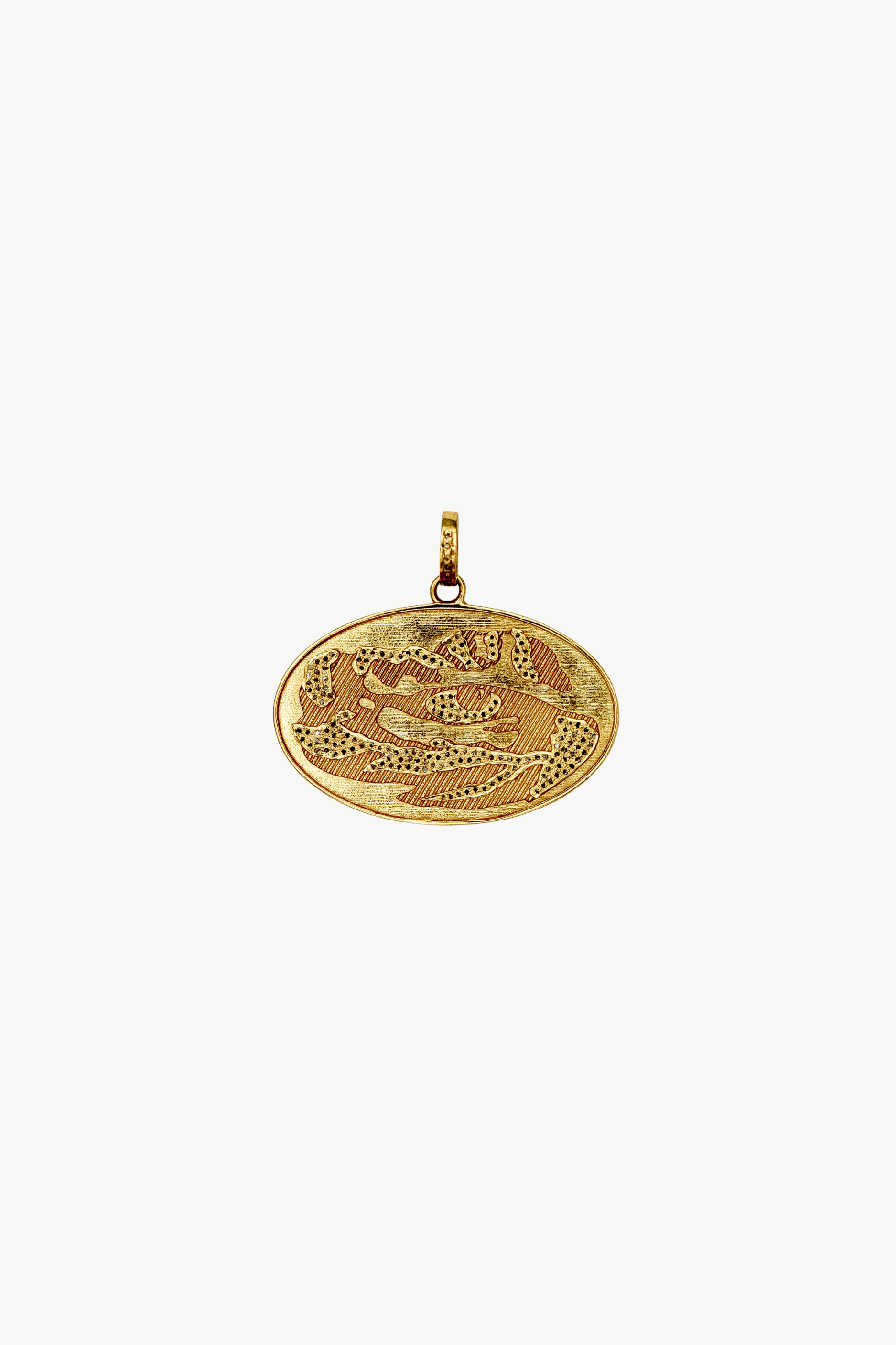 33mm gold-plated oval disc with a pave diamond LSU tiger eye in the center. This pendant is finished with a pave diamond bail and thoughtfully designed using a thick layer of gold and a protective coating, ensuring its beauty and durability for longer wear.