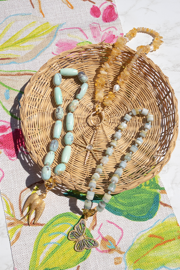 Meet the Adair - an 18.5" chunky, hand-beaded necklace made with mixed sizes of bold barrel dragon skin agate beads and gold-filled saucer spacers. Big and full of personality, she's basically the jewelry equivalent of throwing on a fabulous jacket....suddenly that boring outfit is looking pretty cool. This necklace is assembled using a pave diamond lobster clasp and signature H ring with a thick layer of gold and a protective coating, ensuring its beauty and durability for longer wear.