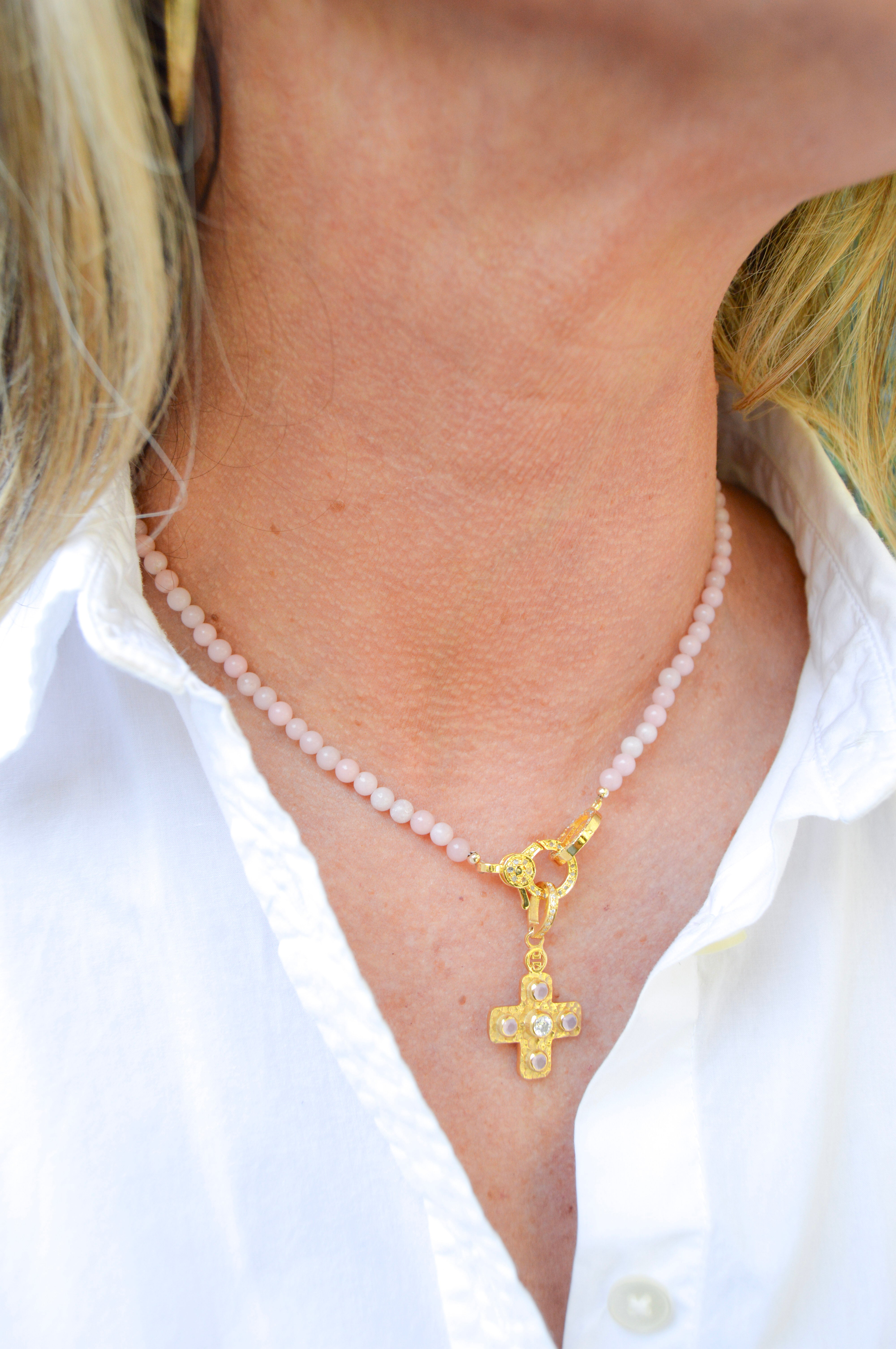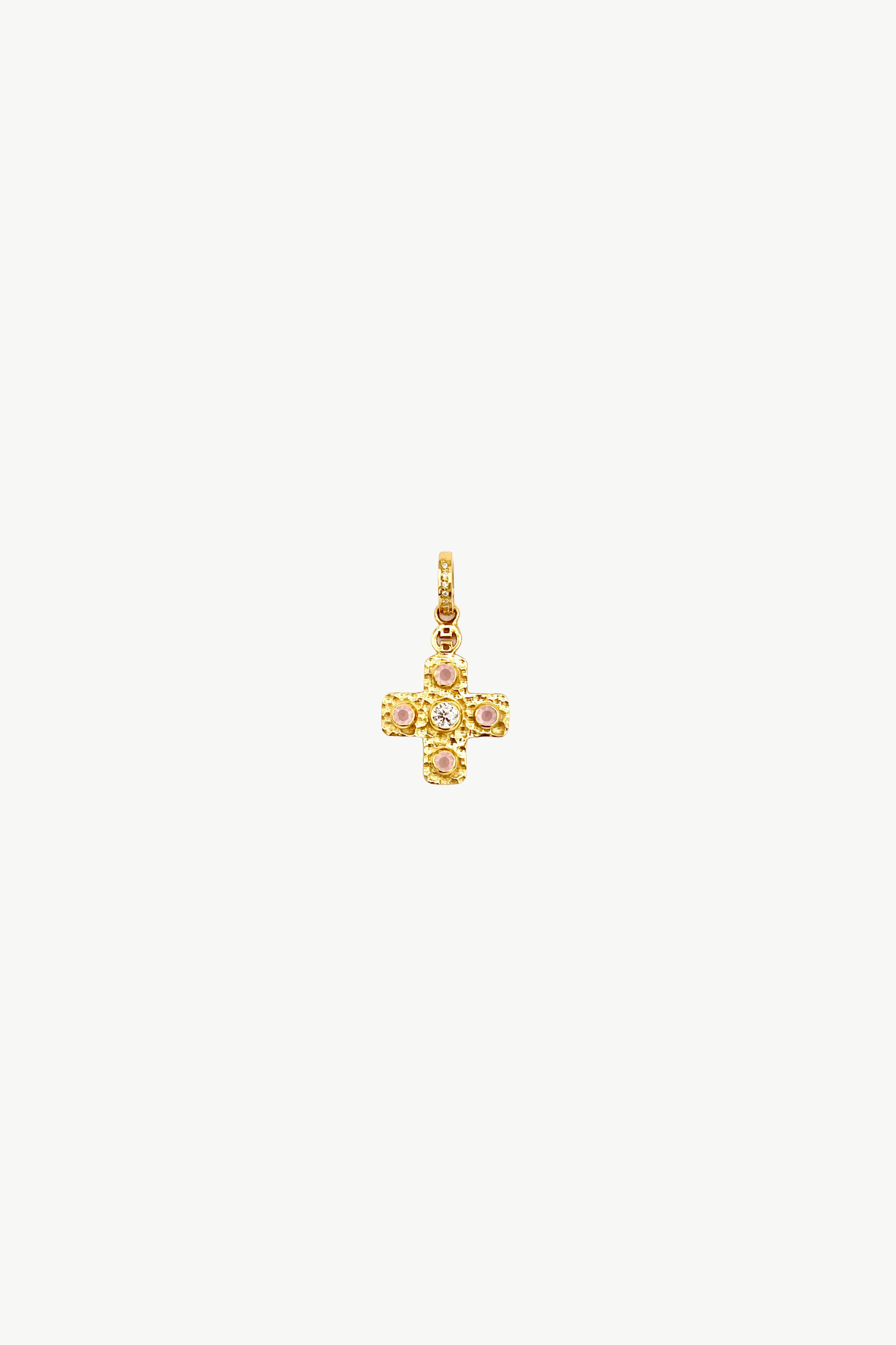 Meet Althea, a cross that embodies strength, grace, and timeless beauty. Crafted from hammered gold-plate, this small square cross carries an artisanal texture that catches the light from every angle. Adorning its surface are carefully selected rose quartz and moissanite stones, each adding a subtle sparkle and unique character, creating a piece that is both elegant and meaningful. Althea is more than just jewelry - it's a symbol of faith, resilience, and personal style. Perfect worn alone or layered with other treasures, this cross invites refection and radiates quiet strength. This charm is thoughtfully designed using a thick layer of gold and a protective coating, ensuring its beauty and durability for longer wear.