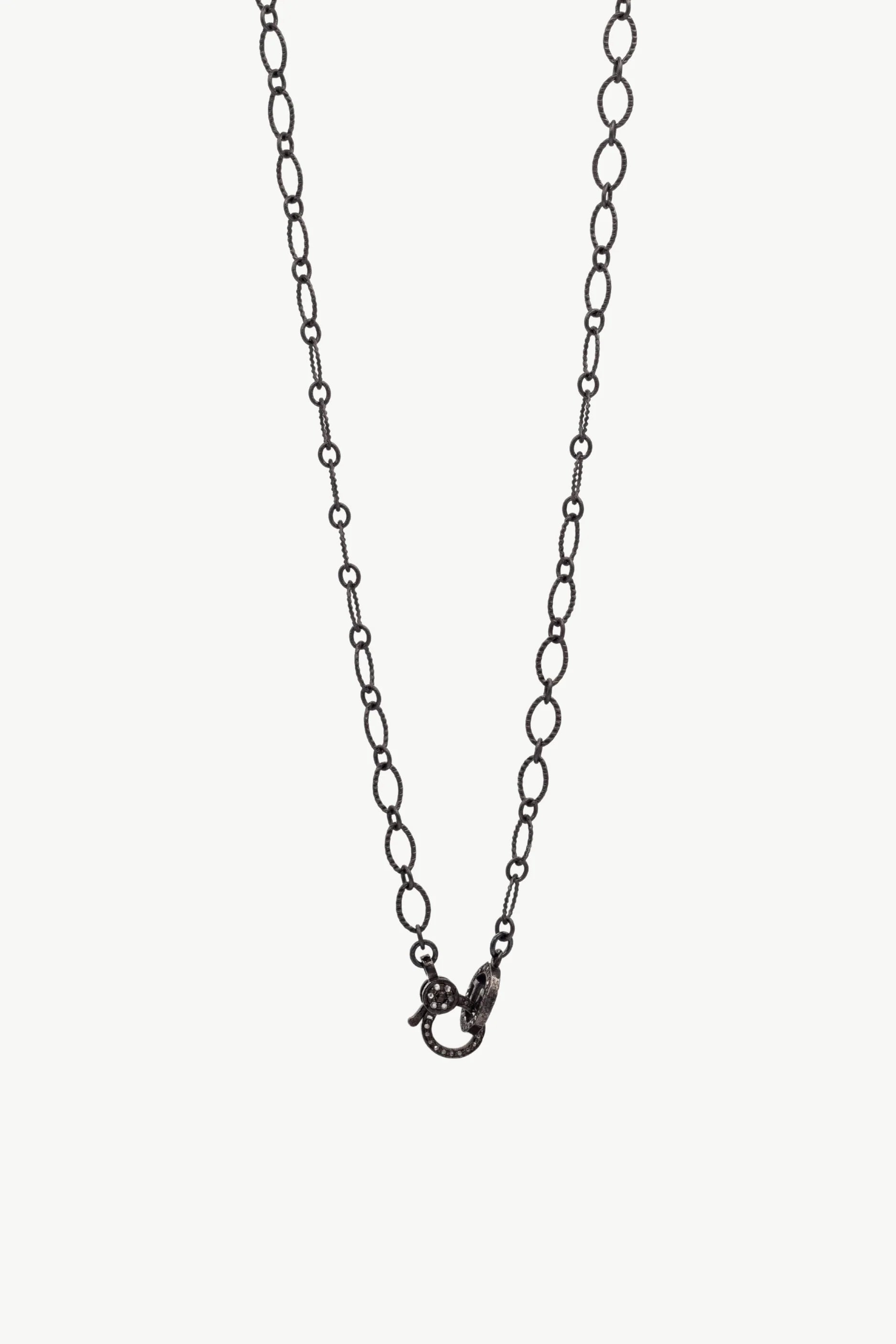 18" brass oval textured 8mm x 4mm link chain in a gunmetal finish with a pave diamond lobster clasp and our signature H ring.