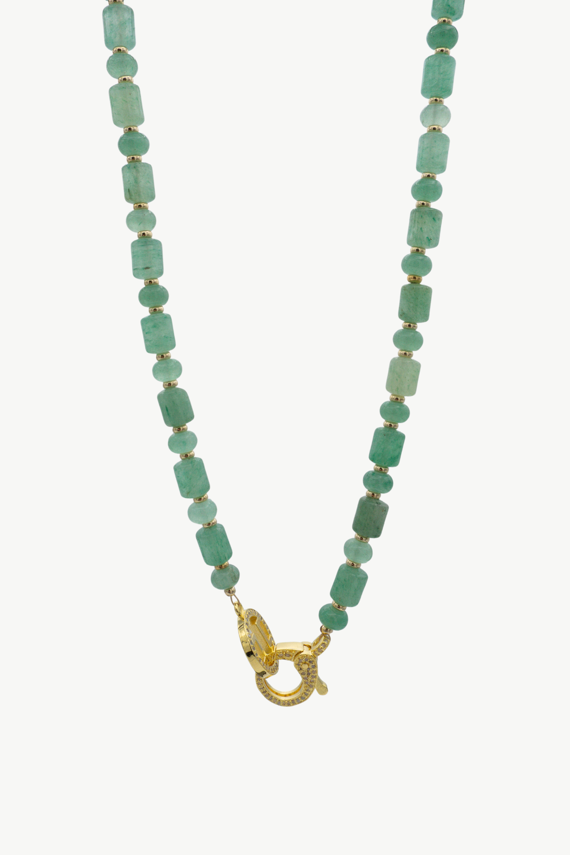 Meet the Augusta - Hand-strung at 16" with a mix of barrel and rondelle-shaped green aventurine beads, she's as rich and vibrant as the fairways at The Masters Tournament. Lush, polished, and unmistakably classic, this is green done right. Green aventurine is often called the stone of opportunity, believed to attract luck, confidence, and forward momentum. Bright gold filled spacer beads sit between each green stone like sunshine on perfectly manicured grass, adding warmth and timeless elegance. Finished with a pave diamond lobster clasp and our signature Harvest Jewels H ring, The Augusta is equal parts Southern tradition and effortless luxury - ready to win best dressed, whether you're on the course, cheering from the clubhouse, or from the comfort of your own home. This necklace is thoughtfully designed using a lobster clasp with a thick layer of gold and a protective coating, ensuring its beauty and durability for longer wear.