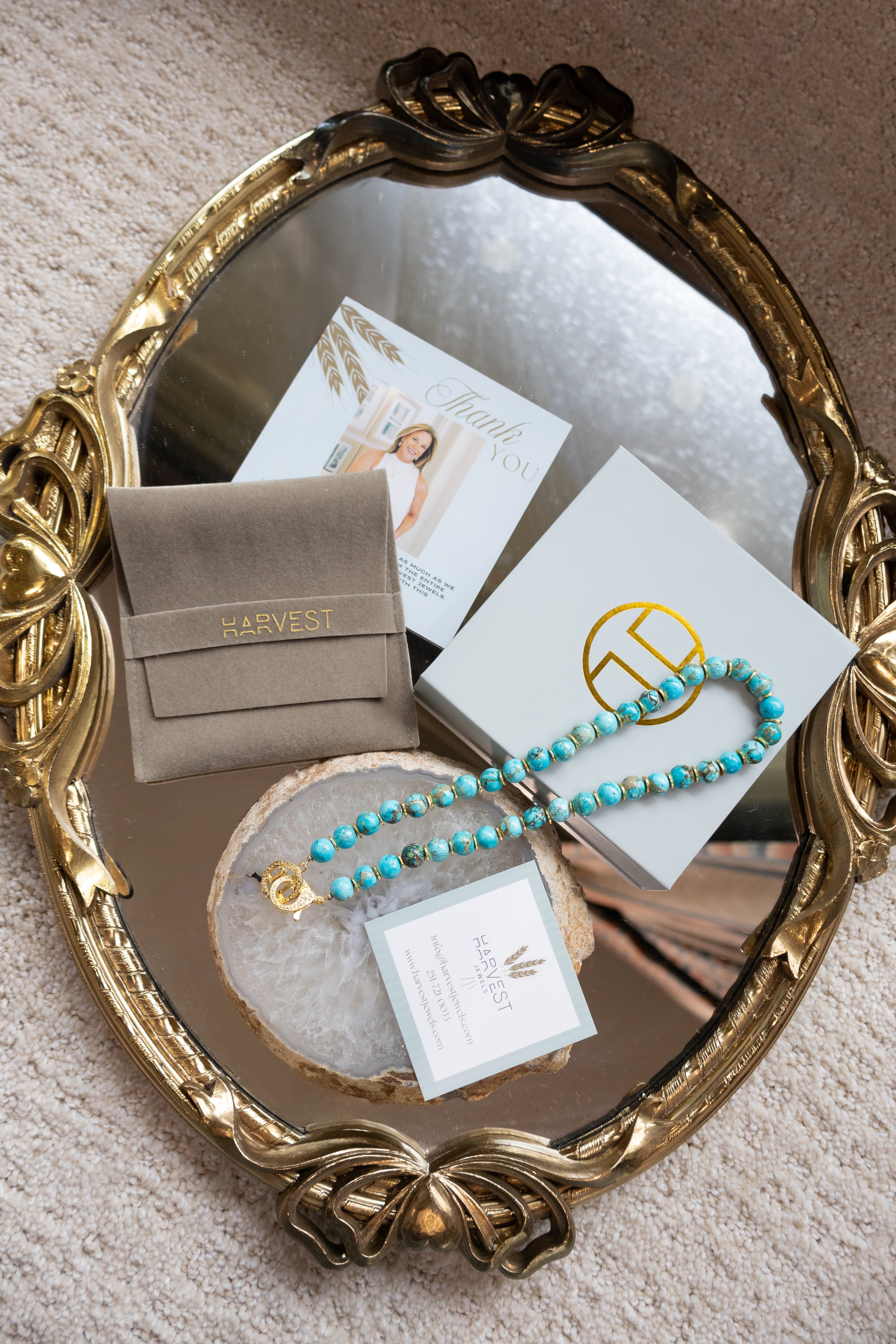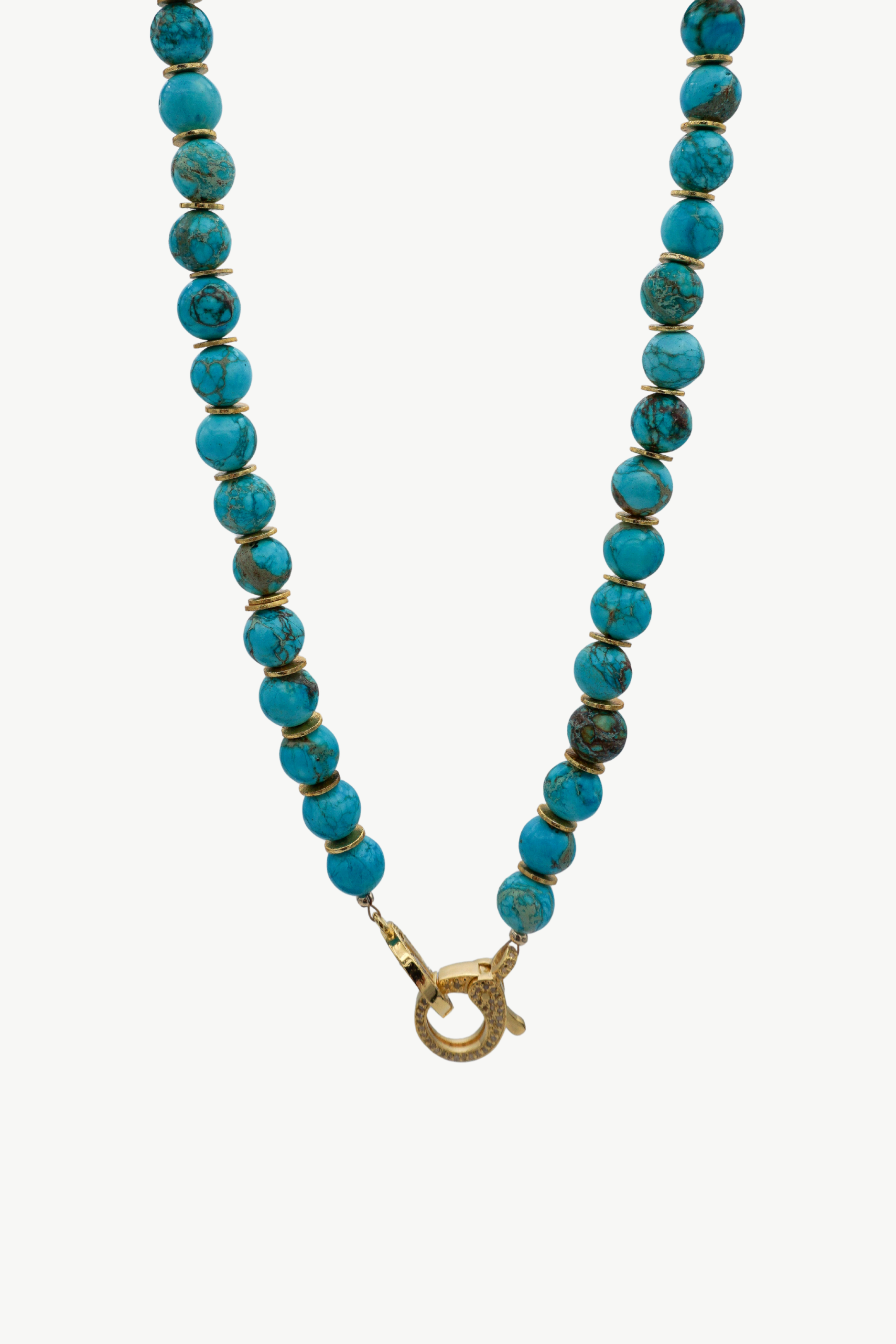 Meet the 16" Charlotte - your little string of seaside confidence. Hand-strung with 8mm smooth, round ocean blue Impression jasper beads, she carries the calming rhythm of rolling waves and wide open skies. Known as a nurturing stone, Impression jasper is believed to bring peace, grounding, and emotional steadiness - the kind of quiet strength that keeps you centered no matter what the day holds. Bright gold metal spacer beads rest between each bead, adding warmth and polish to her tranquil blue tones. Finished with a pave diamond lobster clasp and our signature Harvest Jewels H ring, she's effortless, luminous, and just a touch bold...just like every Charlotte we've ever loved. This necklace is thoughtfully designed using a lobster clasp with a thick layer of gold and a protective coating, ensuring its beauty and durability for longer wear.