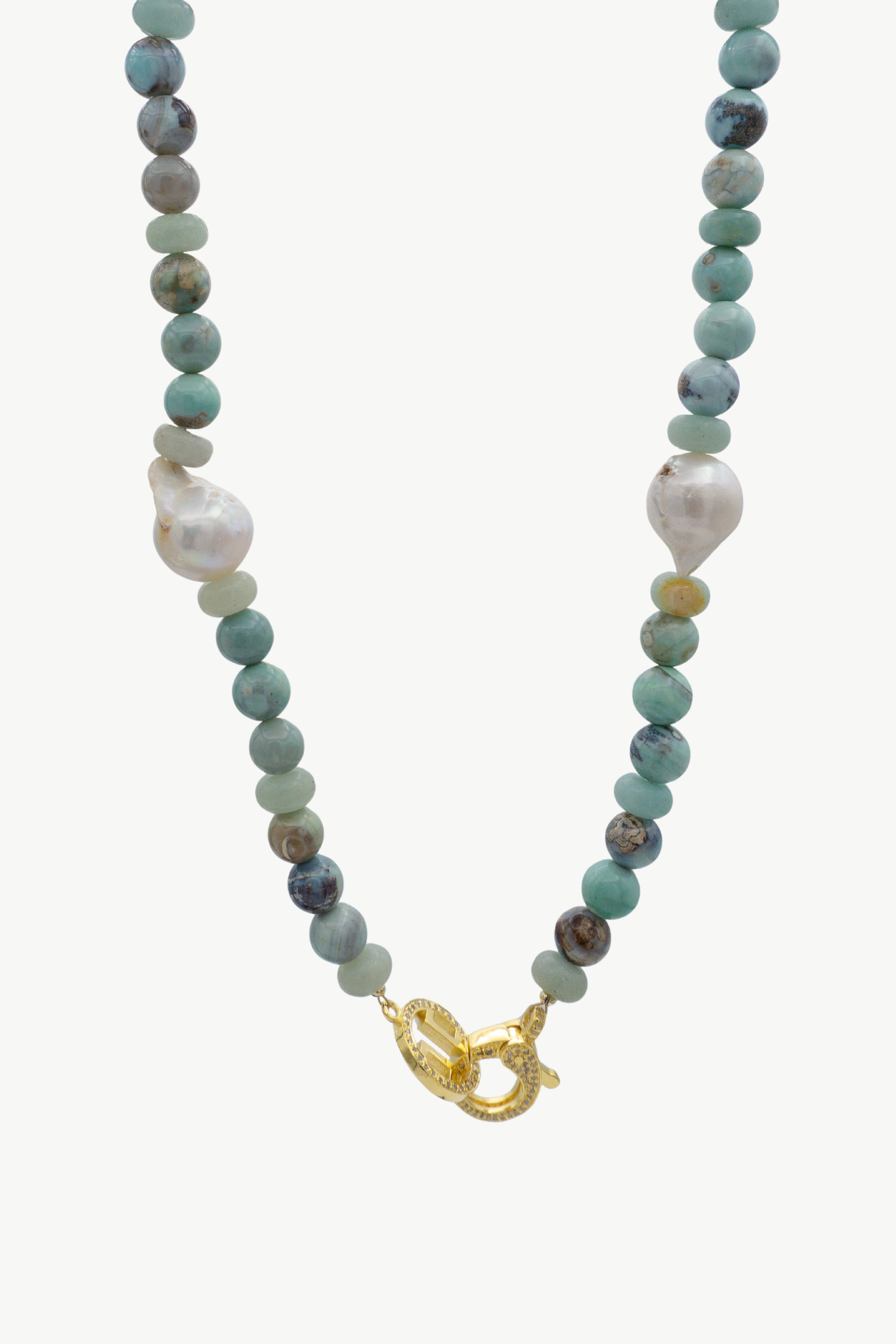 Meet the 17" Laurel - the necklace hand strung with smooth 8mm blue terra beads in the dreamiest robin's egg hue, she's sprinkled with soft amazonite and luminous white Baroque pearls for just the right mix of polish and play. The blues are fresh and coastal, the pearls a little classic, and together they create that effortless moment. She's equal parts garden party and Gulf breeze - easy to layer, impossible to ignore, and guaranteed to brighten absolutely everything you pair with her. This necklace is thoughtfully designed using a lobster clasp with a thick layer of gold and a protective coating, ensuring its beauty and durability for longer wear.