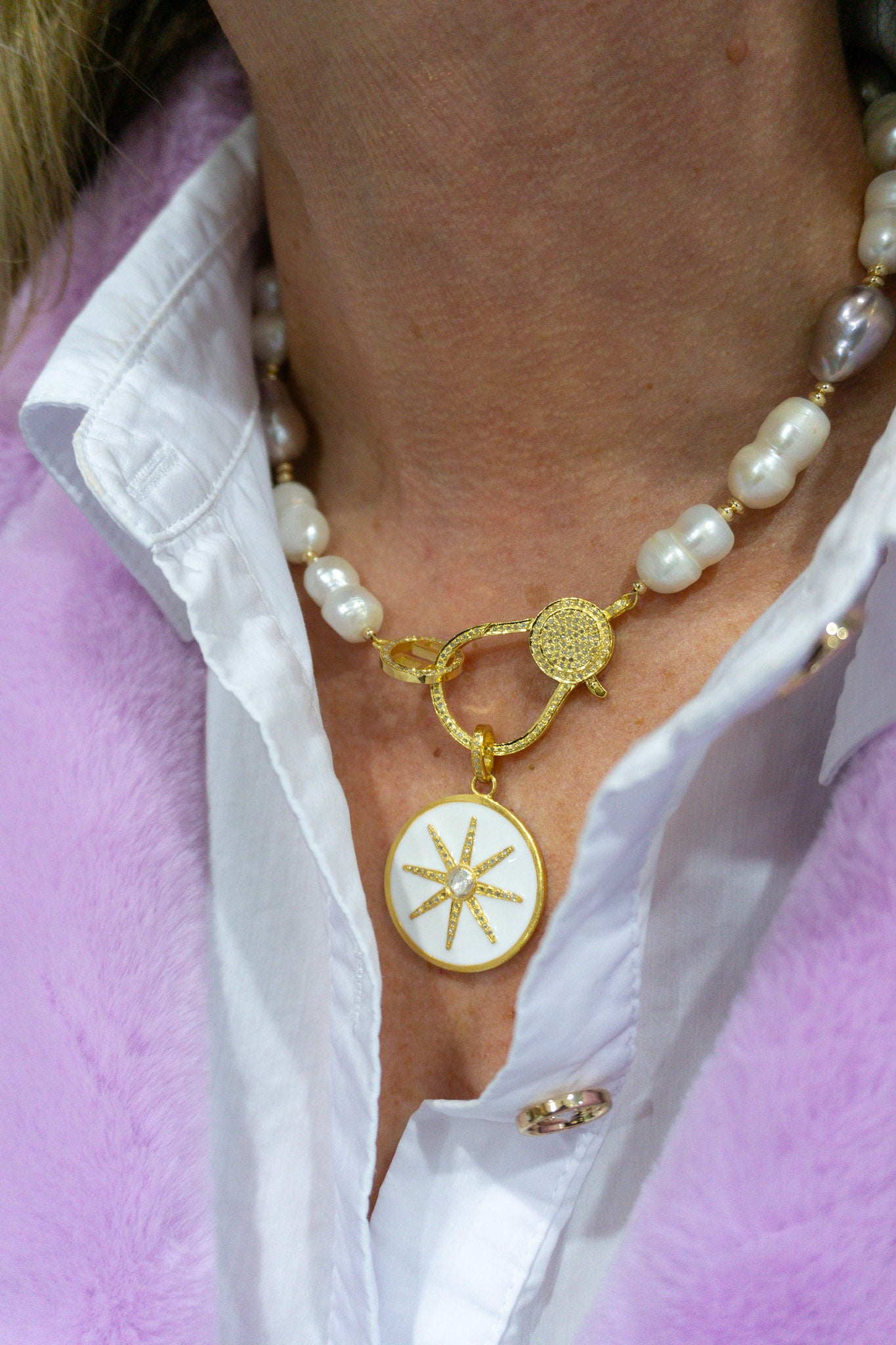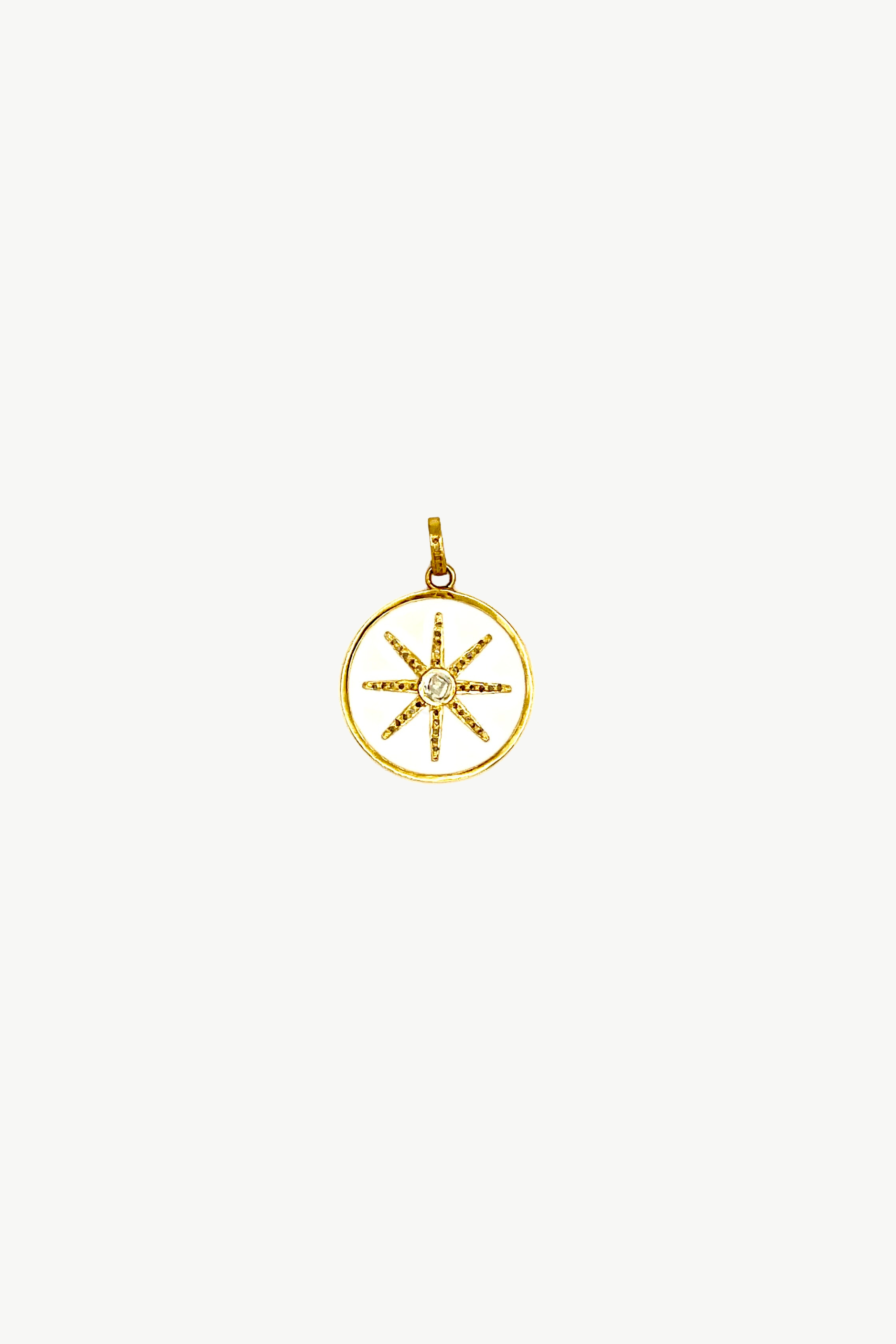 Meet The White Enameled Bright Spot Coin Charm, a new style featuring our signature "Bright Spot" design! Crafted with a radiant design, this charm is meant to serve as a timeless reminder of the "bright spot", whether a person, place or thing, that brings joy and light to your world. Carry your brightest blessings with you always and celebrate the special spark in your life. This charm is a 29mm gold-plated coin shaped charm with a pave and rose cut diamond starburst in the center. It is thoughtfully designed using a luxuriously thick layer of gold and a protective coating, ensuring its beauty and durability for longer wear.