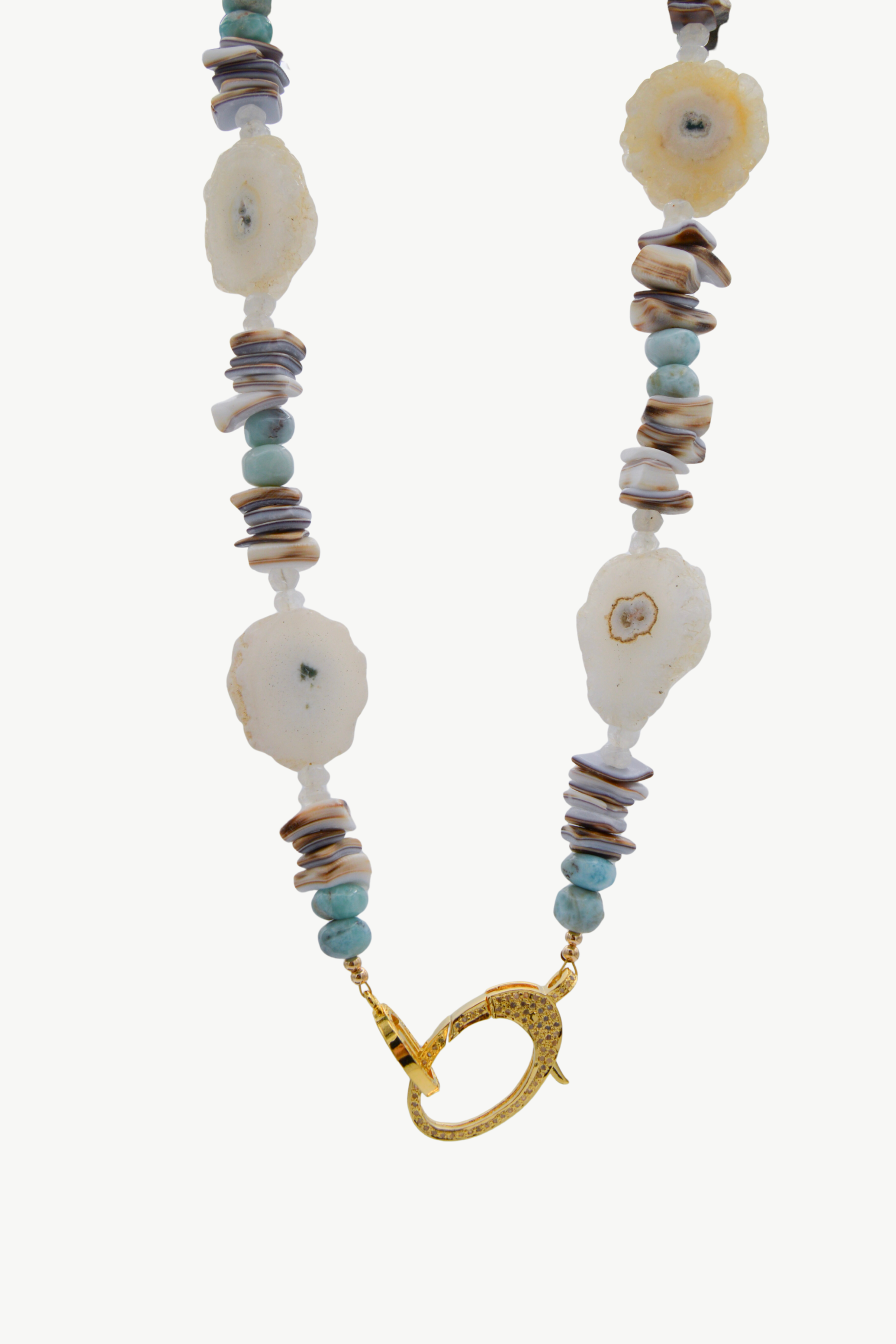 The 17" Wren necklace pairs serene larimar beads with raw solar quartz druzy stalactite slices and organic tiger cowrie shell chip beads for a look that feels effortlessly collected. Finished with a pave diamond lobster clasp and our signature Harvest Jewels H ring, it's equal parts natural beauty and refined detail - perfect for everyday wear with a little something extra. This necklace is assembled using a clasp and H ring with a thick layer of gold and a protective coating, ensuring its beauty and durability for longer wear.