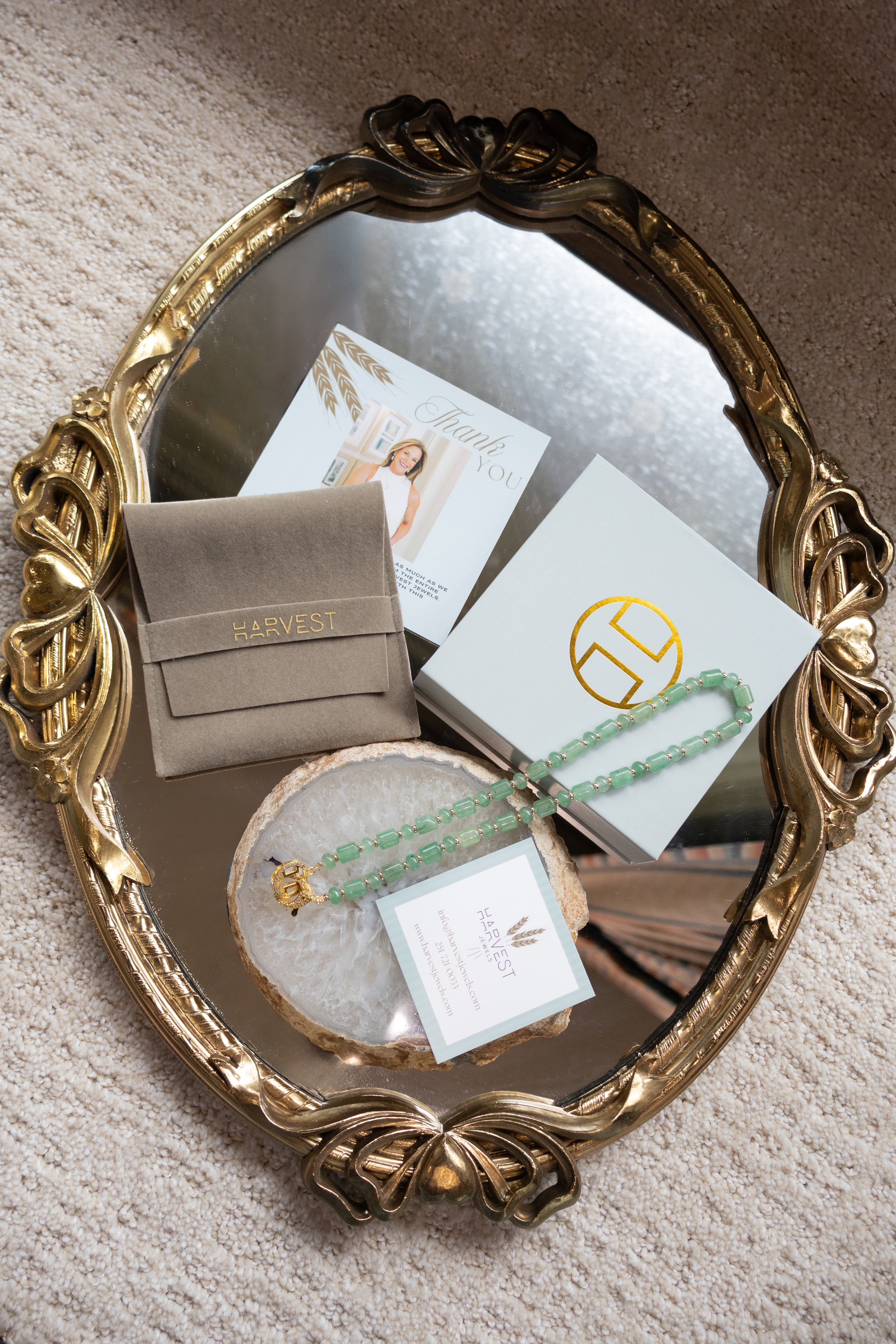 Meet the Augusta - Hand-strung at 16" with a mix of barrel and rondelle-shaped green aventurine beads, she's as rich and vibrant as the fairways at The Masters Tournament. Lush, polished, and unmistakably classic, this is green done right. Green aventurine is often called the stone of opportunity, believed to attract luck, confidence, and forward momentum. Bright gold filled spacer beads sit between each green stone like sunshine on perfectly manicured grass, adding warmth and timeless elegance. Finished with a pave diamond lobster clasp and our signature Harvest Jewels H ring, The Augusta is equal parts Southern tradition and effortless luxury - ready to win best dressed, whether you're on the course, cheering from the clubhouse, or from the comfort of your own home. This necklace is thoughtfully designed using a lobster clasp with a thick layer of gold and a protective coating, ensuring its beauty and durability for longer wear.