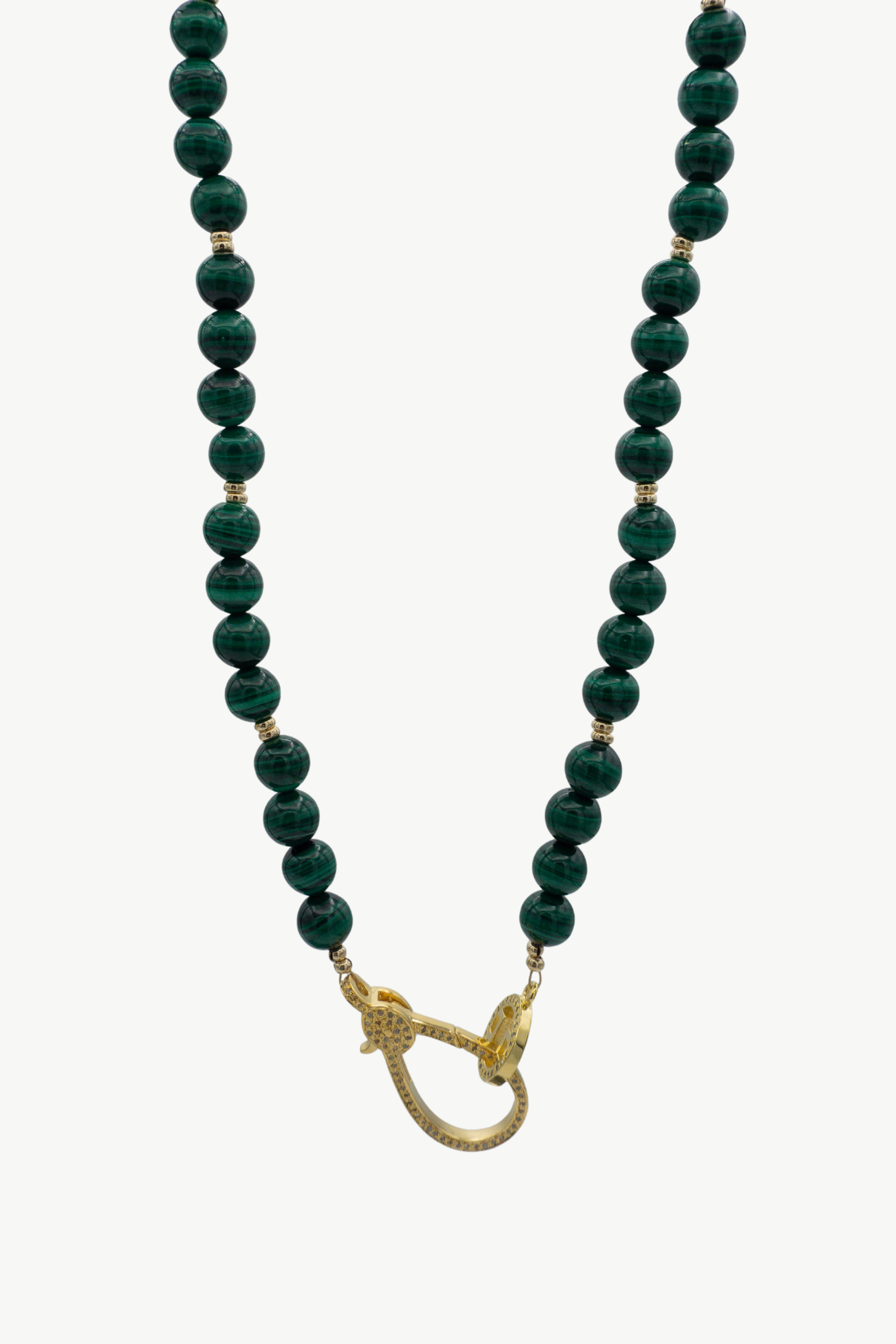 Meet the bold and beautifully classic 17" Hollins necklace. This necklace features 8mm smooth round malachite beads, rich with swirling emerald tones and known as the stone of protection and transformation. Accented with gold-filled spacer beads and finished with our pave diamond lobster clasp and our signature Harvest Jewels H ring, she's equal parts meaning and statement. The Hollins necklace is thoughtfully designed using a lobster clasp with a thick layer of gold and a protective coating, ensuring its beauty and durability for longer wear.