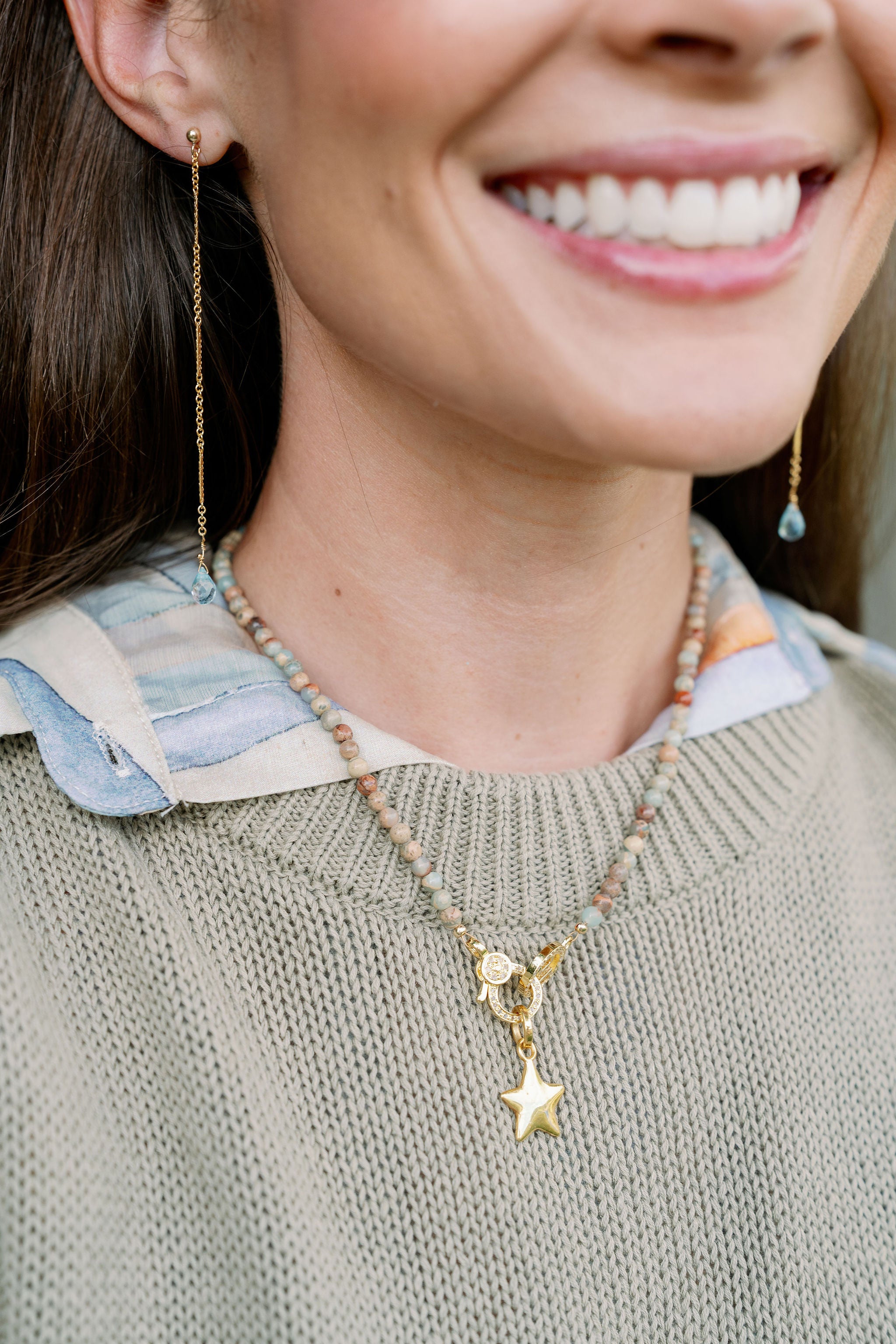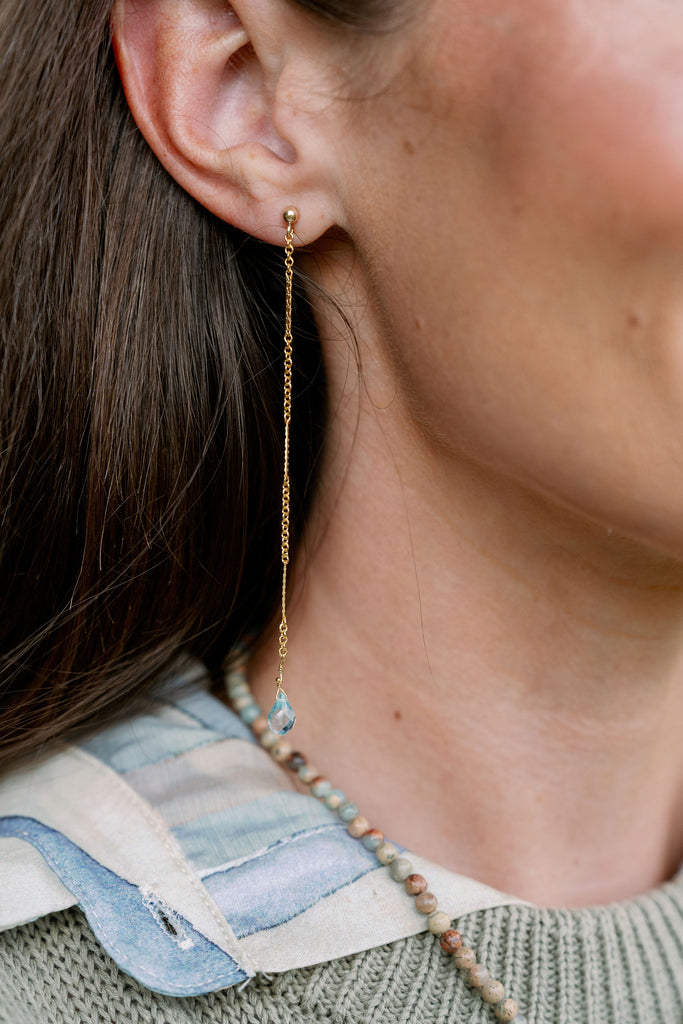 Meet the 3.5" Ophelia duster earrings featuring dainty gold-filled flat bar cable chain finished with faceted 5mm x 7mm teardrop shaped aquamarines. Duster earrings have made a major comeback in 2025, emerging as one of the season's most sought-after jewelry trends. These beautiful earrings add a touch of elegance to any outfit and their delicate design is perfect for anyone who appreciates subtle glamour.