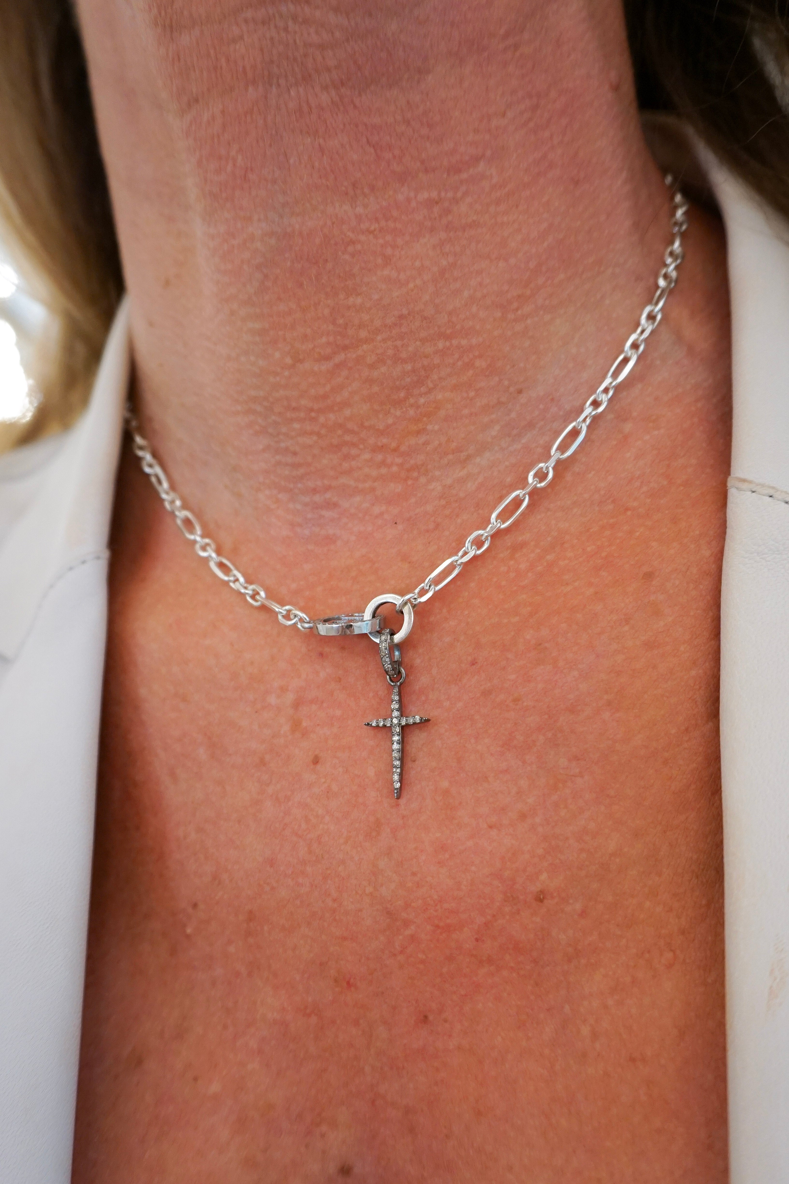 Breloque en forme de croix en argent sterling oxydé ou plaqué or et pavé de diamants de 20 mm x 12 mm (0,75") avec extrémités pointues.
