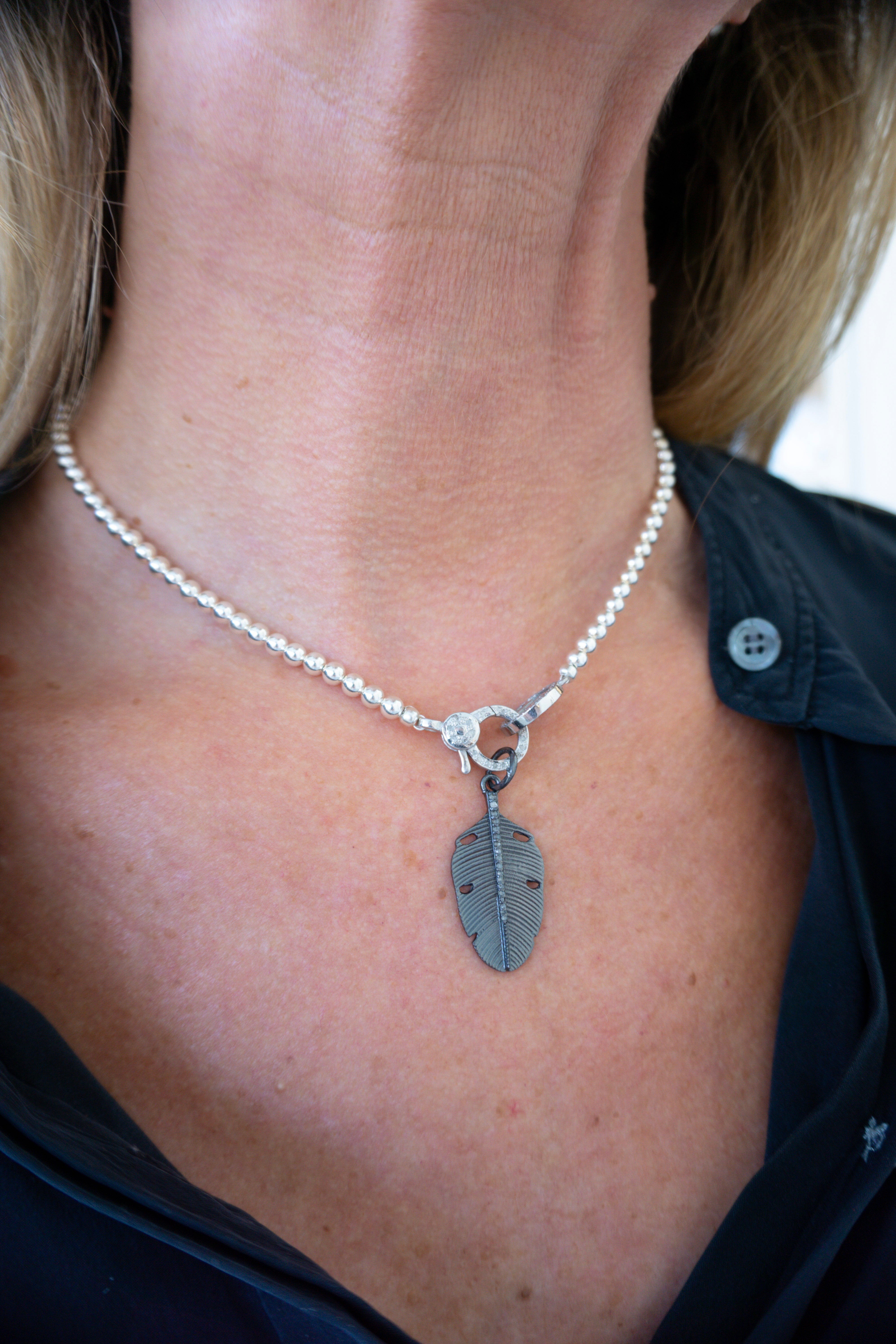 Pendentif plume texturé en argent sterling oxydé mat de 16 mm x 30 mm, orné d'une ligne de diamants pavés au centre. Ce pendentif est recouvert d'un revêtement protecteur, garantissant beauté et durabilité pour une utilisation prolongée.