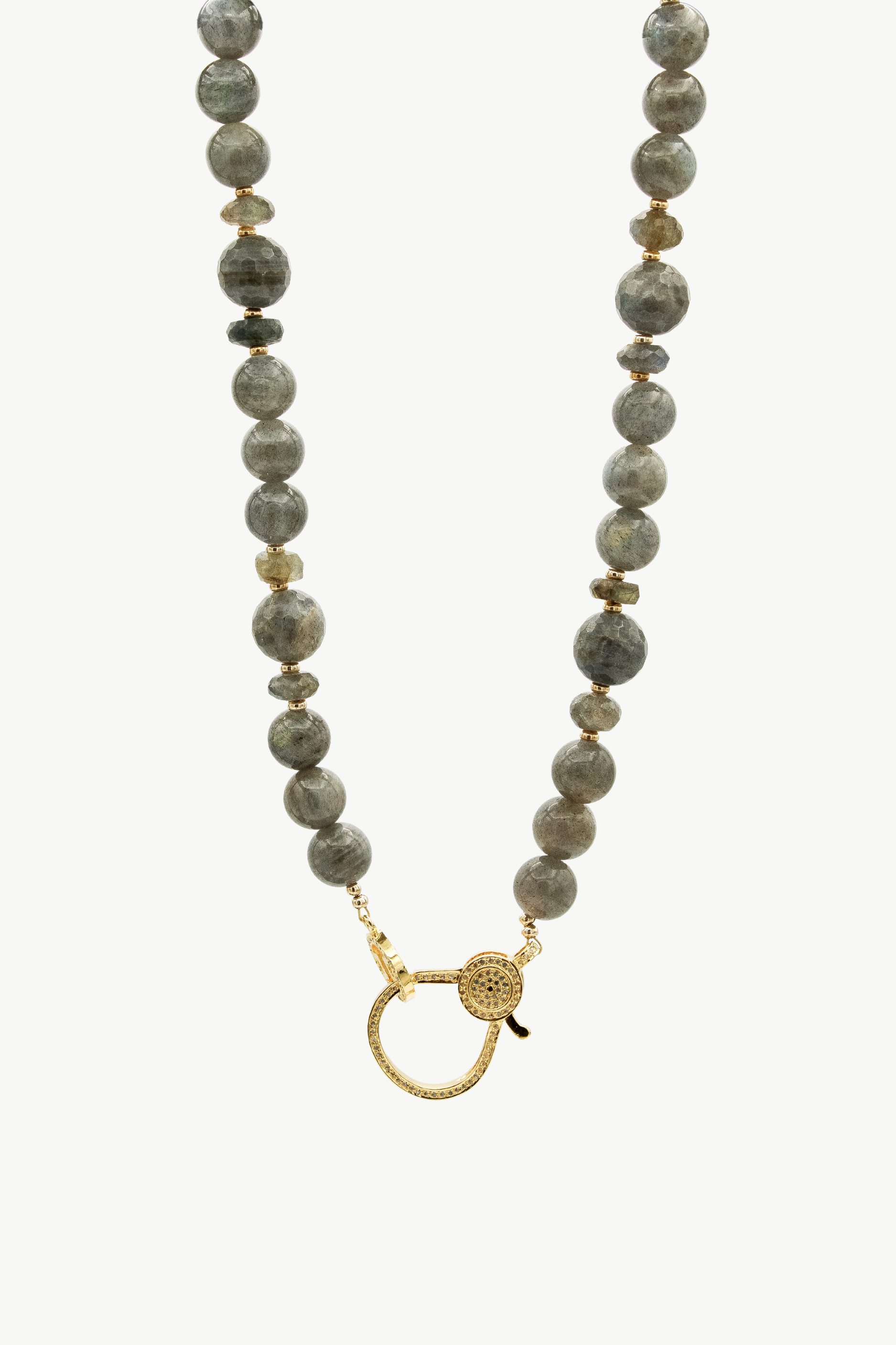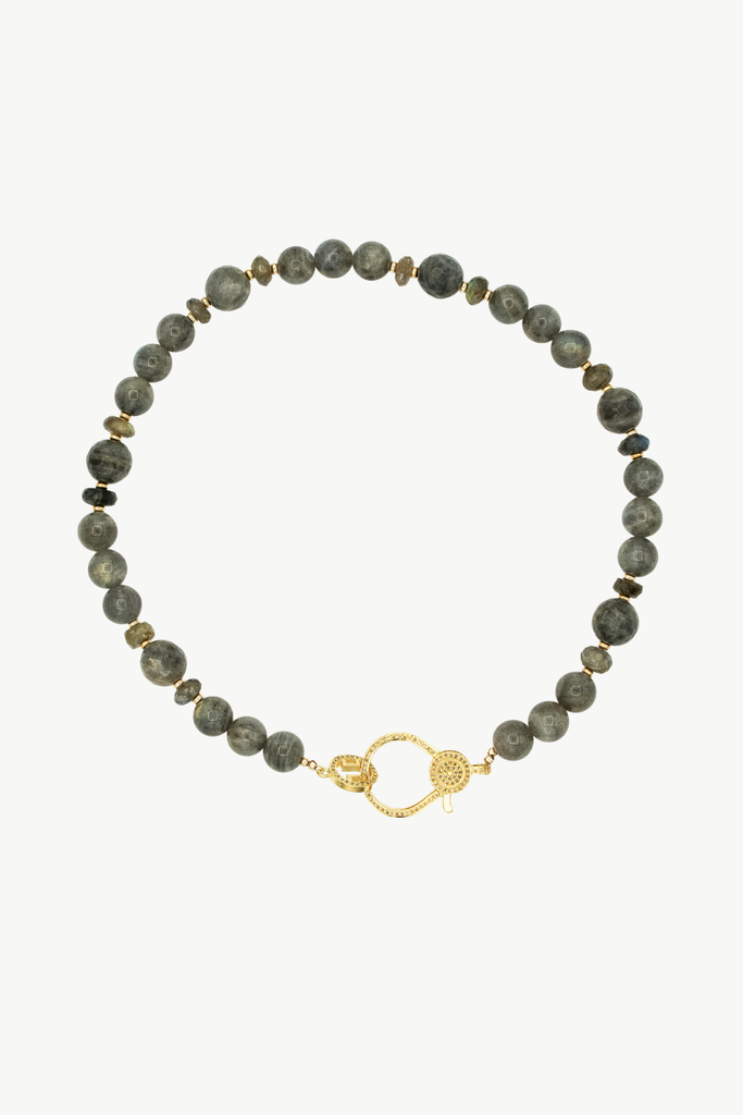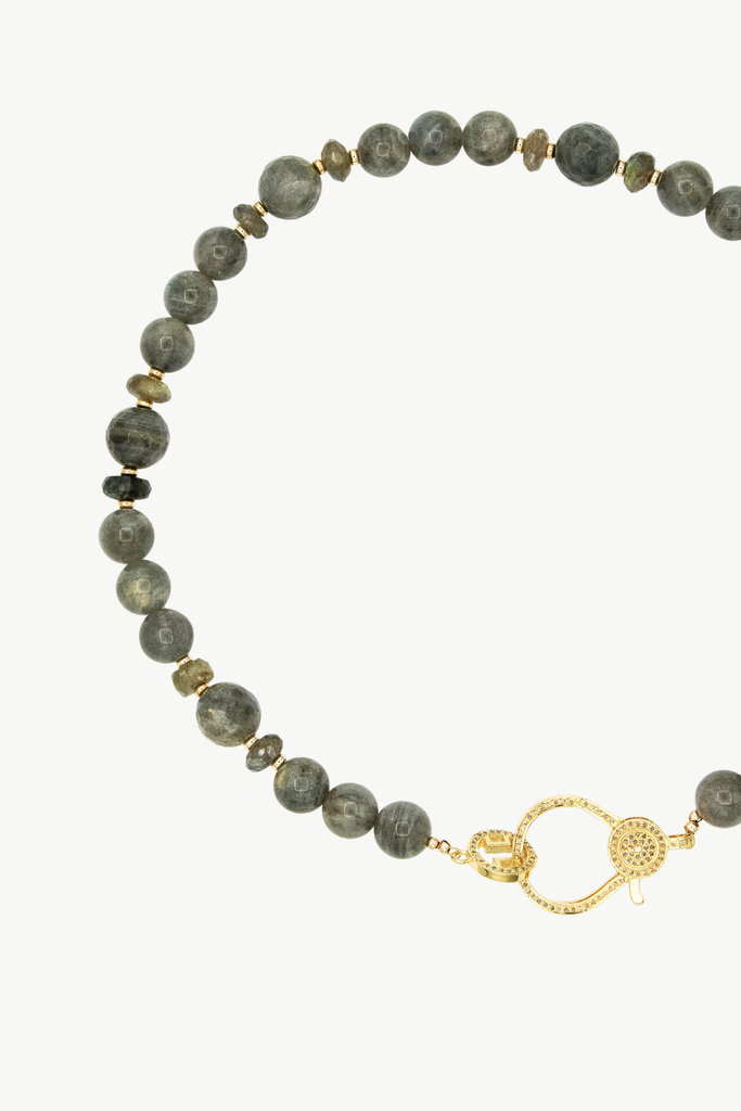 Like twilight caught in a strand, the 17" Bella shimmers with the quiet magic of labradorite. Each bead is its own little universe - smooth 10mm rounds, faceted 12mm orbs, and sparkling 8mm x 5mm rondelles - reflecting hues of deep grey, stormy blue, and whispers of mossy green. The play of light across the stones feels alive, shifting with every movement, a reminder that beauty is never static. Between the gemstones, glimmers of 3mm gold-filled rondelles bring a gentle warmth, like golden sunlight breaking through the clouds.