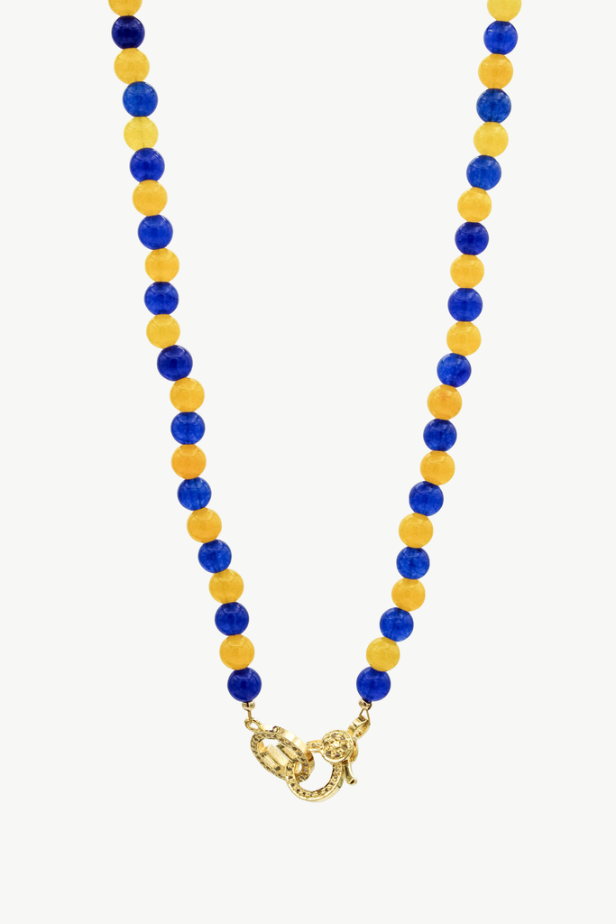 This blue and yellow beaded necklace is the perfect accessory for all University of Michigan, Notre Dame, and Fairhope School fans.