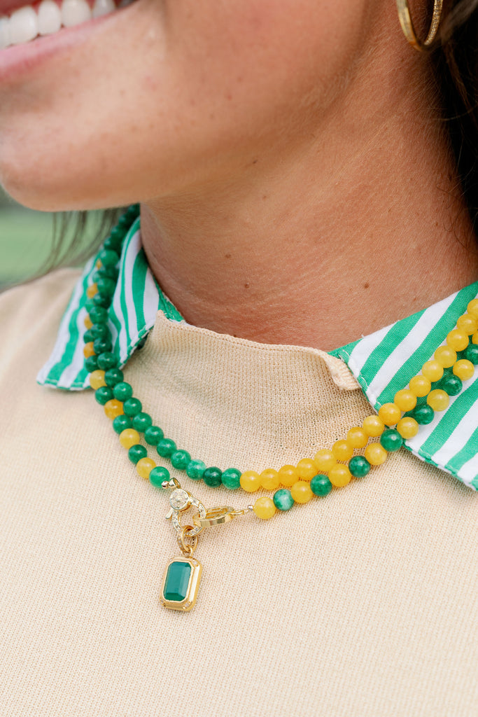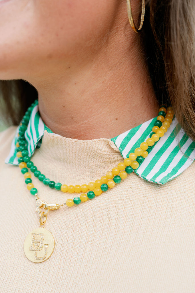 This green & yellow gemstone necklace is the perfect accessory for all Baylor University fans.