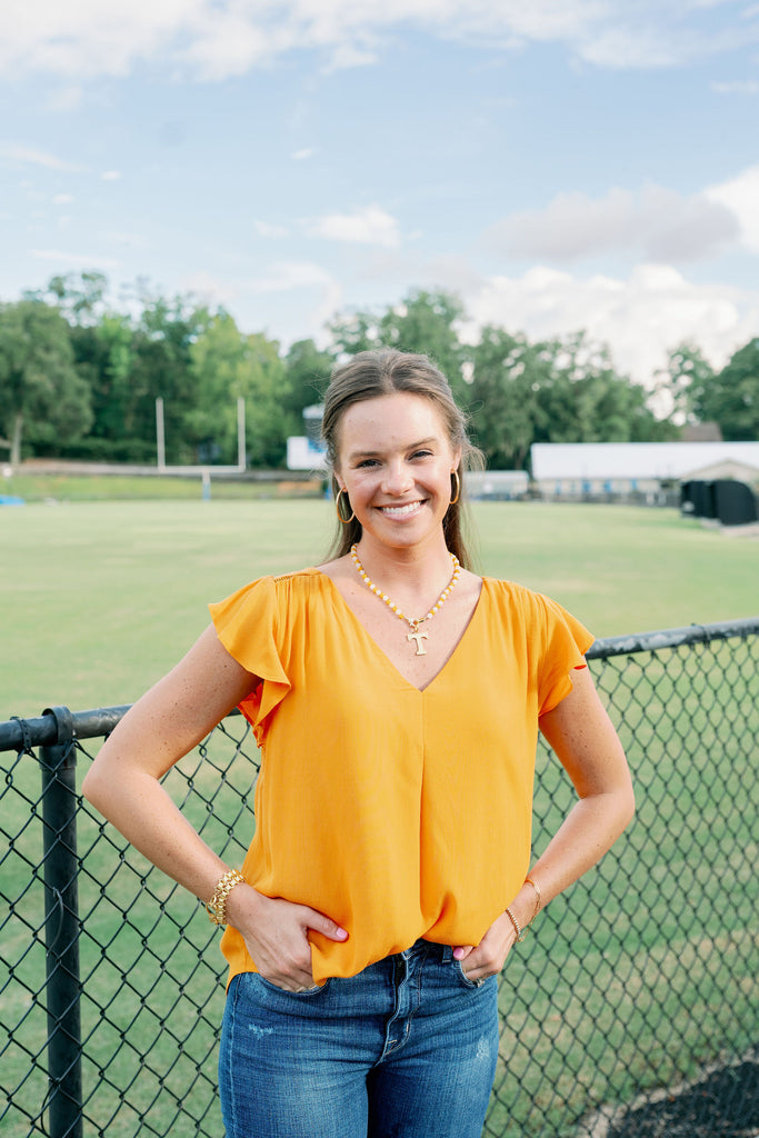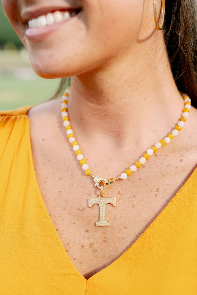 28mm yellow gold-plated pave diamond T pendant for the University of Tennessee Volunteers fans. This pendant is finished with a pave diamond bail and is thoughtfully designed using a thick layer of gold and a protective coating, ensuring its beauty and durability for longer wear. Go Vols!