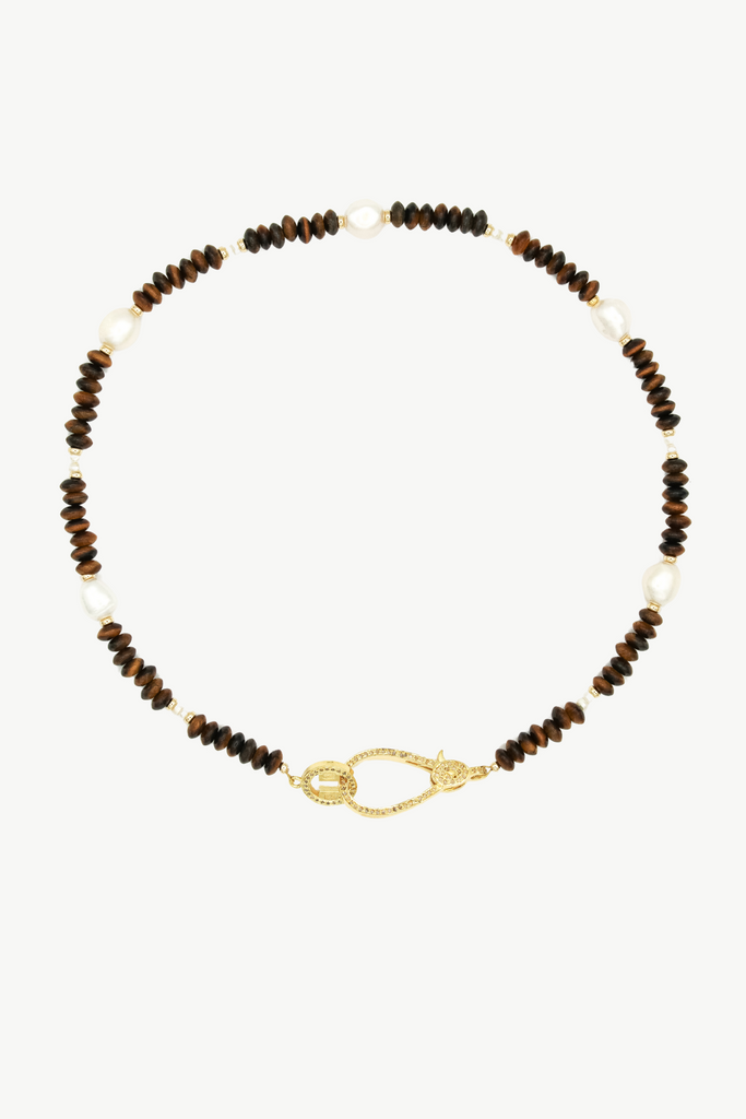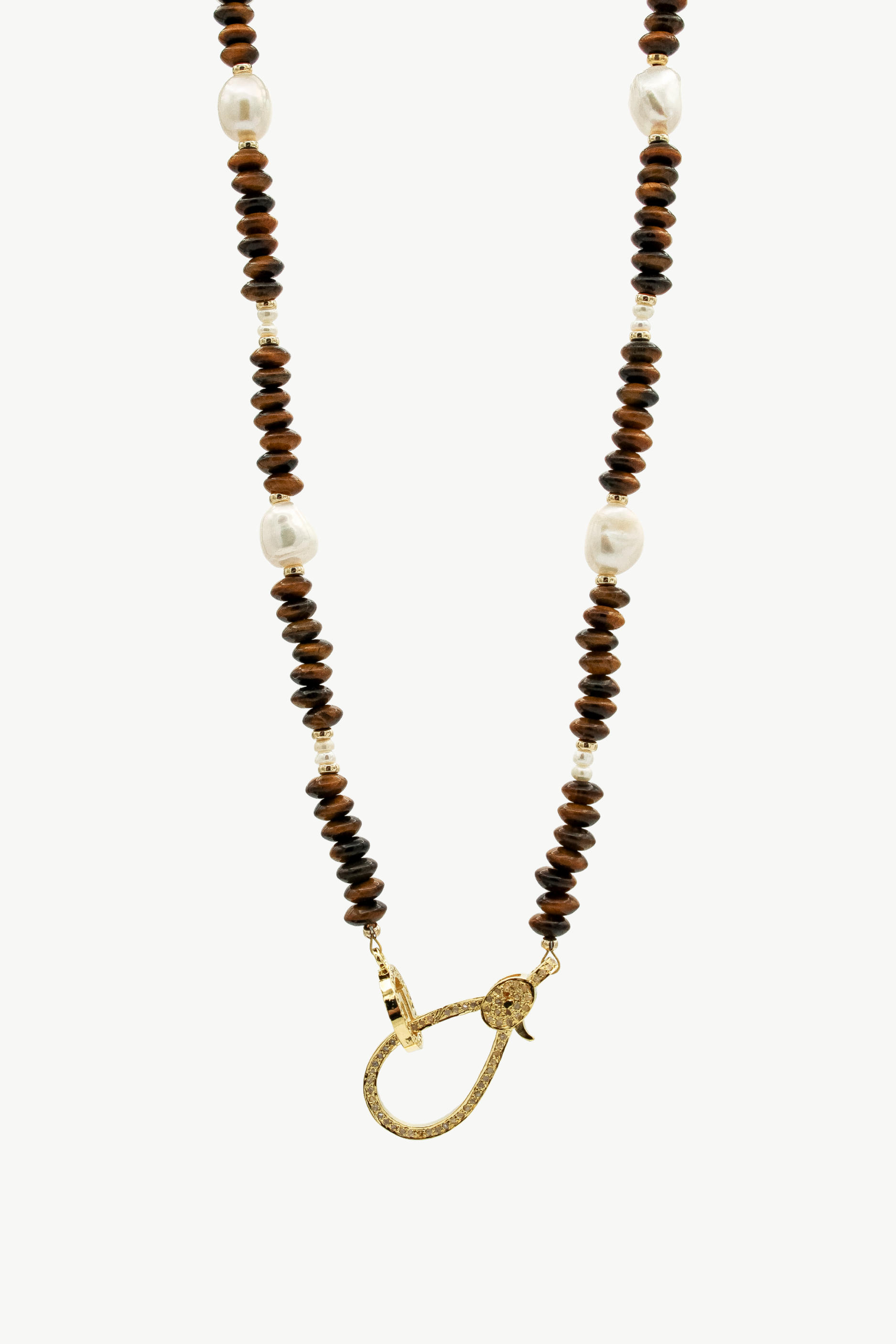 Meet the 17" Amber - a necklace that's equal parts earthy soul and polished elegance. Smooth 3mm x 6mm tiger's eye rondelles bring that golden-brown glow and mesmerizing shimmer, like sunlight caught in motion. Delicate white seed pearls and 3mm gold-filler spacer beads keep things bright and balanced. Just when you think you know her, she surprises you with luminous 10mm white potato pearls dispersed throughout, adding a touch of sophistication and Southern charm. Amber is that rare blend of grounded and glamorous - the kind of necklace that goes just as well with jeans and a tee as it does with a little black dress. She's your everyday muse with a hint of mystery. This necklace is assembled using a pave diamond lobster clasp and our signature H ring with a luxuriously thick layer of gold and a protective coating, ensuring its beauty and durability for longer wear.