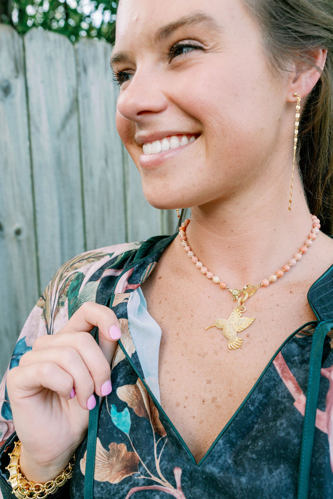 The 16" Noel Necklace - Peachy perfection with a golden glow! The Noel necklace is here to brighten your day, and your neckline. Featuring smooth 6mm round orange calcite beads in the dreamiest soft peach hue, this strand gives off effortless warmth and good vibes. 3mm gold-filled saucer-shaped spacers add just the right hint of shimmer between each bead, making it an easy favorite for layering or wearing solo. This necklace is finished with a sparkling pave diamond lobster clasp and our signature Harvest Jewels H ring thoughtfully designed using a thick layer of gold and a protective coating, ensuring its beauty and durability for longer wear. Noel is cheerful, charming, and ready to shine wherever you go!