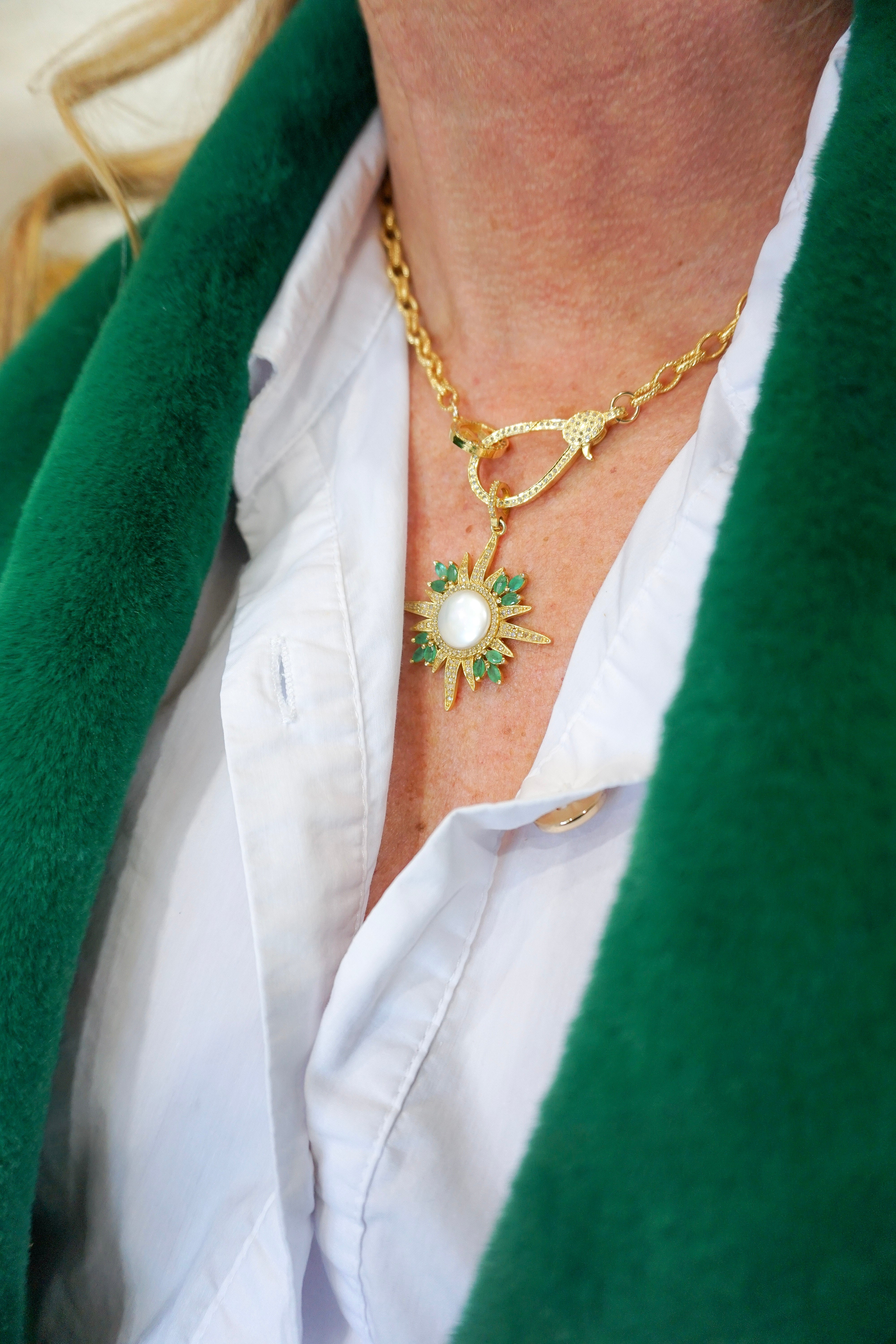 A luminous celebration of light, this 36mm x 39mm starburst pendant features a glowing 12mm round white pearl at its center. Four long pave diamond rays extend outward, and between each, three smaller rays glimmer, each accented with sparkling marquis-shaped emeralds that catch the light with every movement.